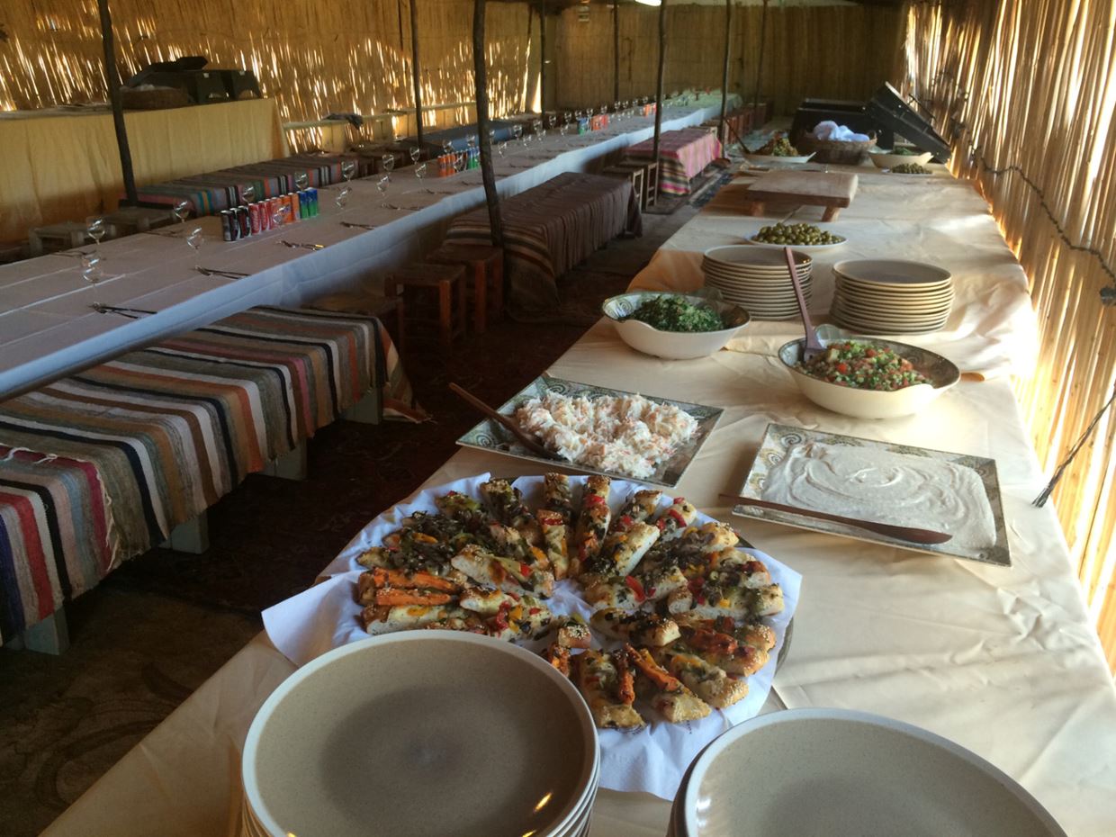 R: Preparamos comidas simples y auténticas utilizando métodos tradicionales: pan fresco, ensalada de verduras crujientes, hummus local y tahini, bebidas calientes y verduras de temporada preparadas utilizando técnicas consagradas por el tiempo, tal como lo hacían las familias nómadas.