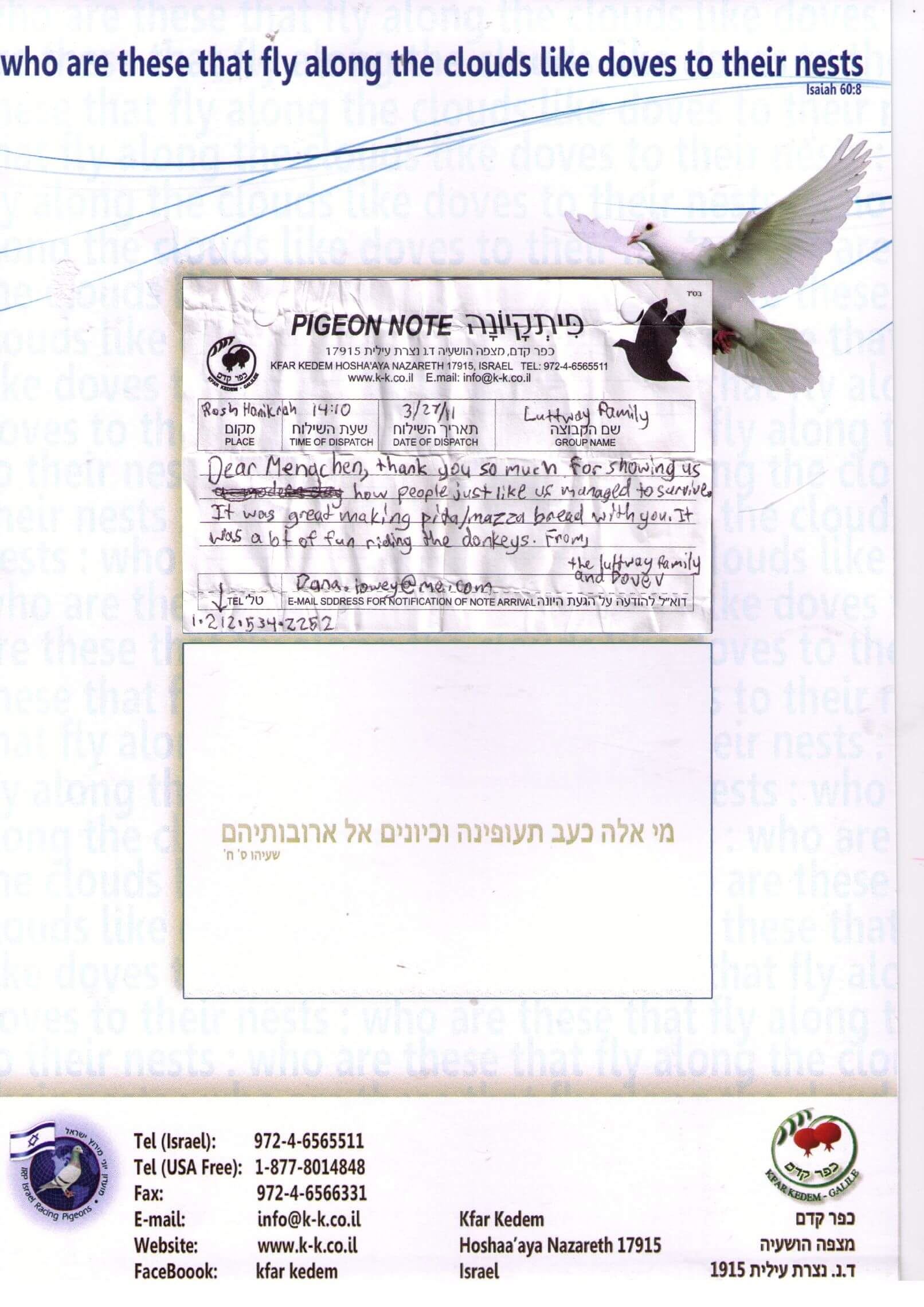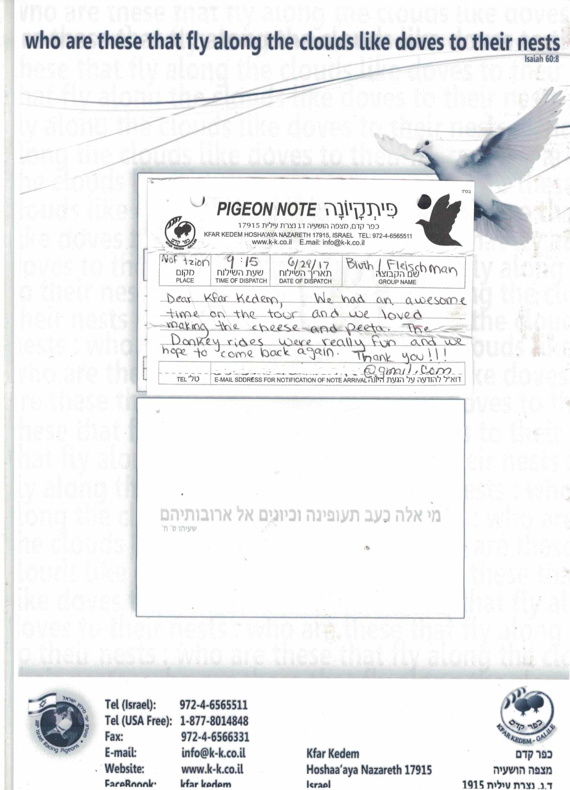 Наше занятие с почтовым голубем приглашает вас написать свою записку, прикрепить ее к голубю и открыть для себя магию древней связи через небеса Галилеи. Это незабываемое приключение для семей и групп.