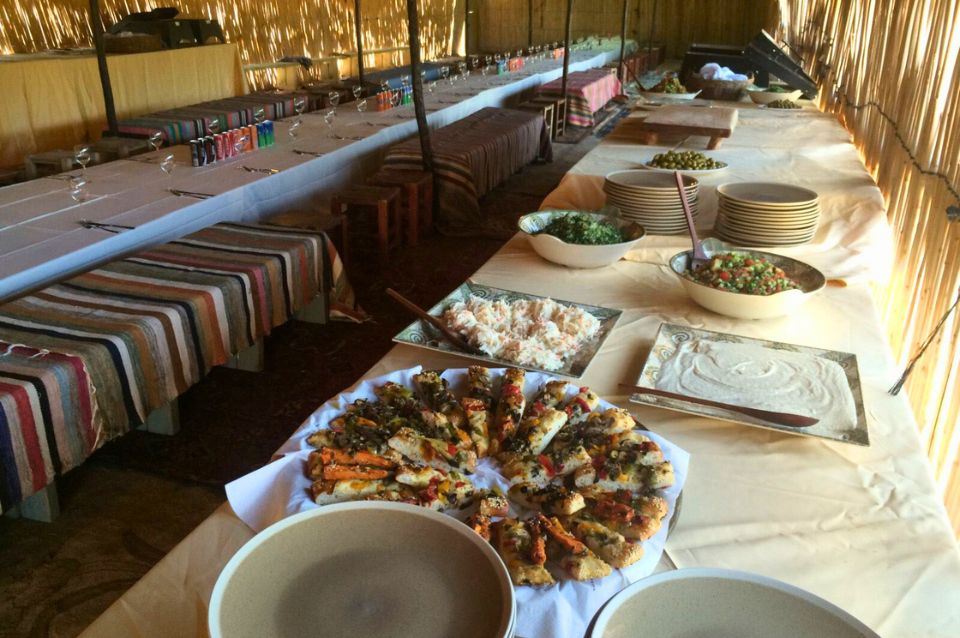 A: We prepare simple, authentic meals using traditional methods-fresh bread, crisp vegetable salad, local hummus and tahini, warm drinks, and seasonal vegetables prepared using time-honored techniques just as nomadic families did.
